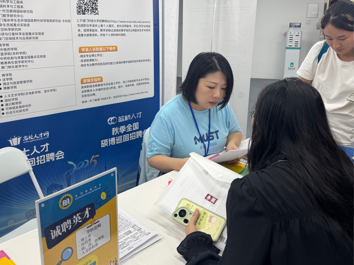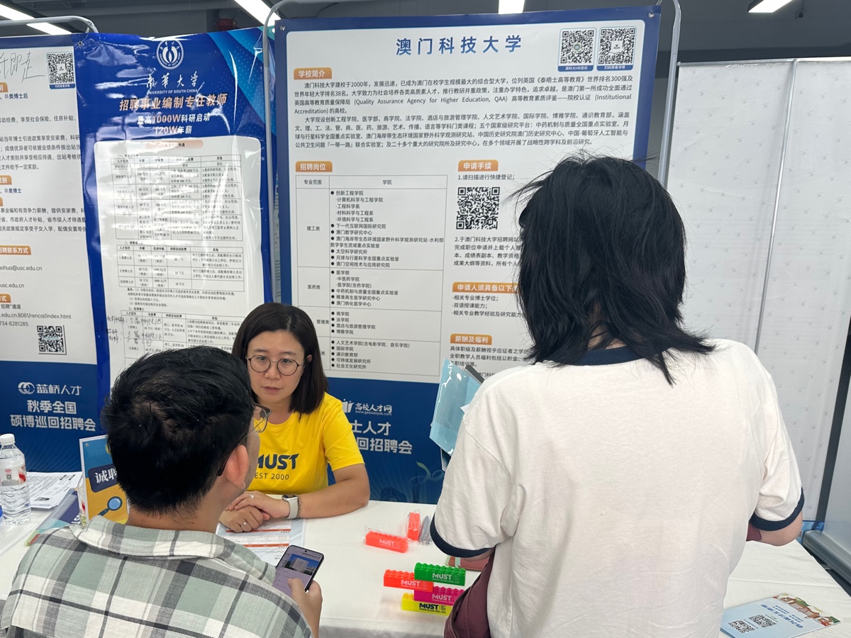 依託大學各科領域及各類科研平台資源等多方優勢,大學展位吸引了大量求職者前來問詢。人力資源處同事以專業、熱情的態度,向求職者介紹了大學概況、人才發展規劃以及工作生活便利措施等資訊,並誠摯邀請各領域優秀人才加入澳科大團隊。